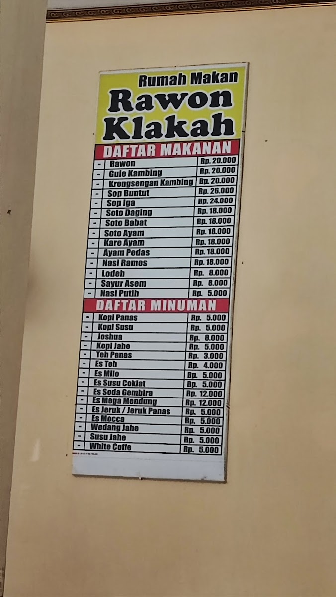 Highlights include traditional favorites like Rawon Empal and Sop Iga Klakah, alongside other local classics such as Krengsengan Kambing and Ayam Pedas. These dishes pair naturally with the simple yet thoughtful selection of drinks, including refreshing Es Teh and comforting Kopi Susu. The menu also features side dishes like Tempe Telur Asin Perkedel that blend well with the main plates, offering a balanced and familiar taste of the region.